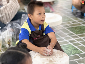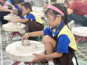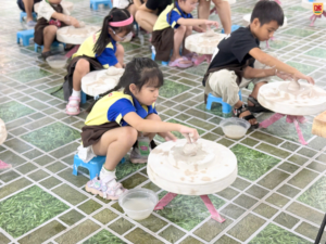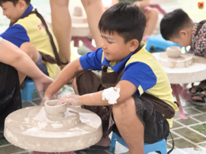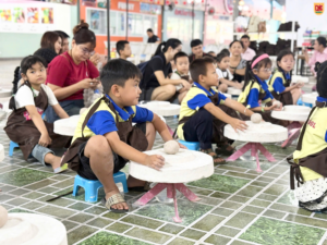 Đây có lẽ là hoạt động khiến các bạn nhỏ tò mò nhất. Được ngồi trước bàn xoay, tự tay chạm vào đất sét mềm và từ từ tạo hình thành chiếc chén nhỏ xinh – đó là một cảm giác rất đặc biệt. Nhiều bạn ban đầu còn bỡ ngỡ, nhưng chỉ sau vài phút đã bắt đầu thích thú và chăm chú tạo hình cho sản phẩm của mình.