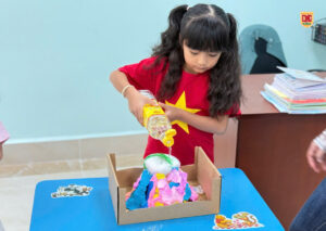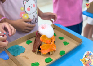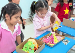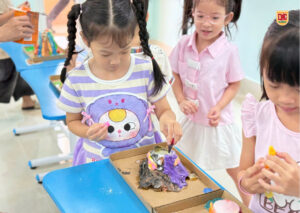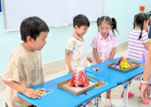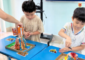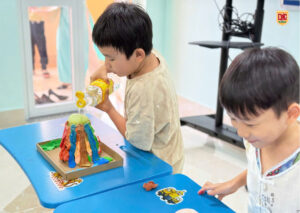 👐 Các con còn được tự tay chuẩn bị và thực hiện thí nghiệm dưới sự hướng dẫn của giáo viên! Từ việc trộn các nguyên liệu đơn giản như giấm, nước rửa chén và baking soda, các bé đã học được cách tạo ra một phản ứng hóa học ngoạn mục mô phỏng lại cảnh núi lửa phun trào với dòng “dung nham” đỏ rực, cuồn cuộn! 🌋